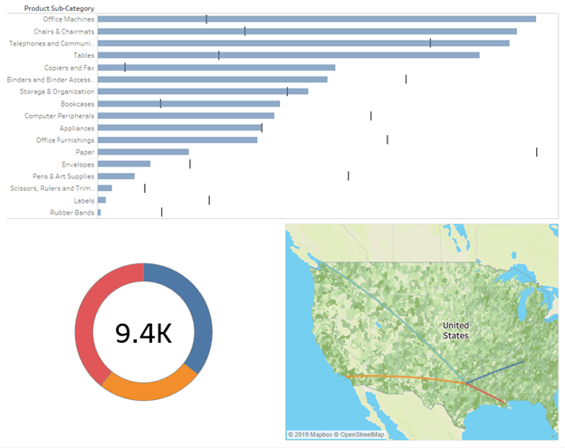 So let’s give that a try! For this exercise I have created some sample views using the all too familiar Sample Superstore data set. I’m just going to drop three of the charts I’ve created in my dashboard shell. Feel free to create and drop as many sheets as you would like. Here’s my current dashboard: